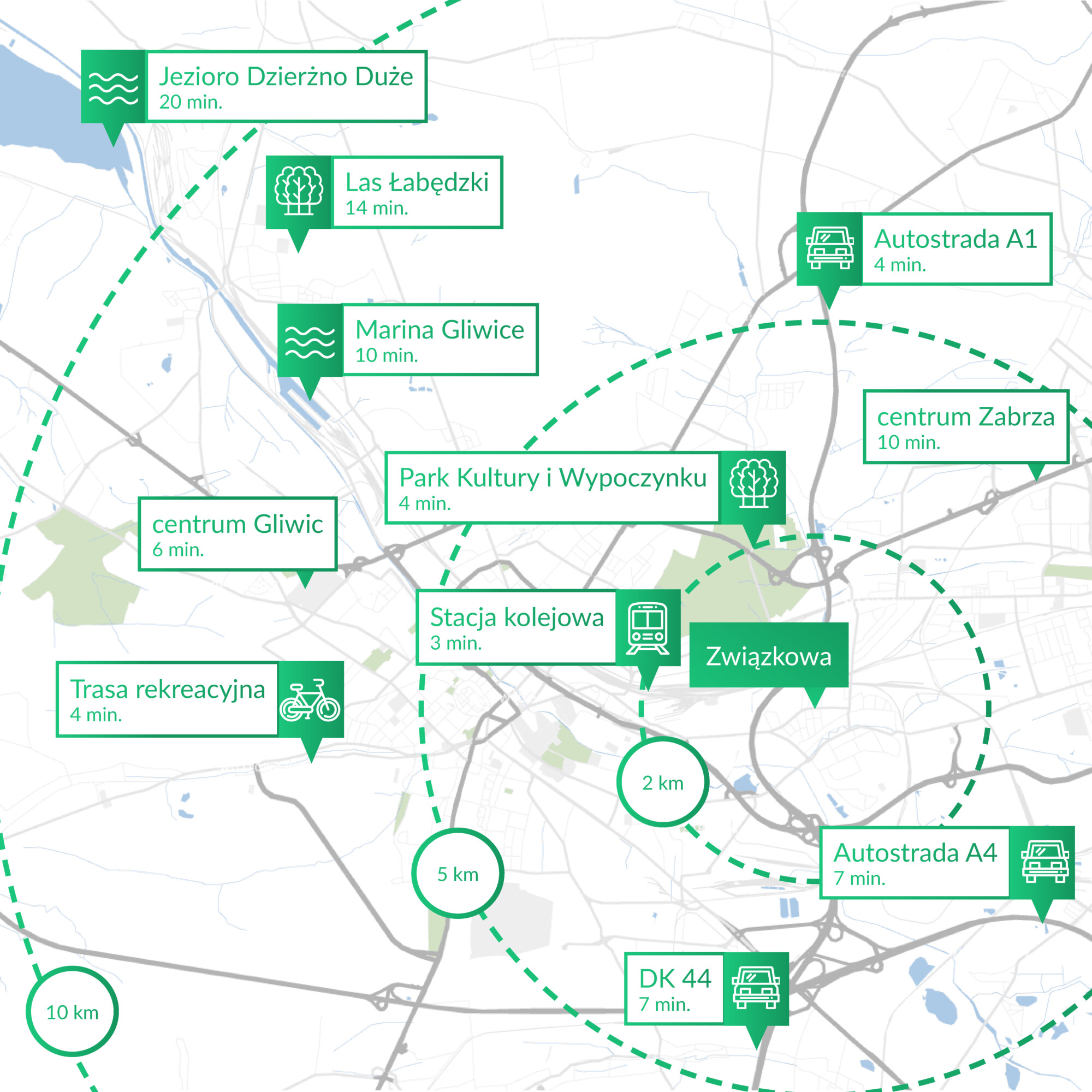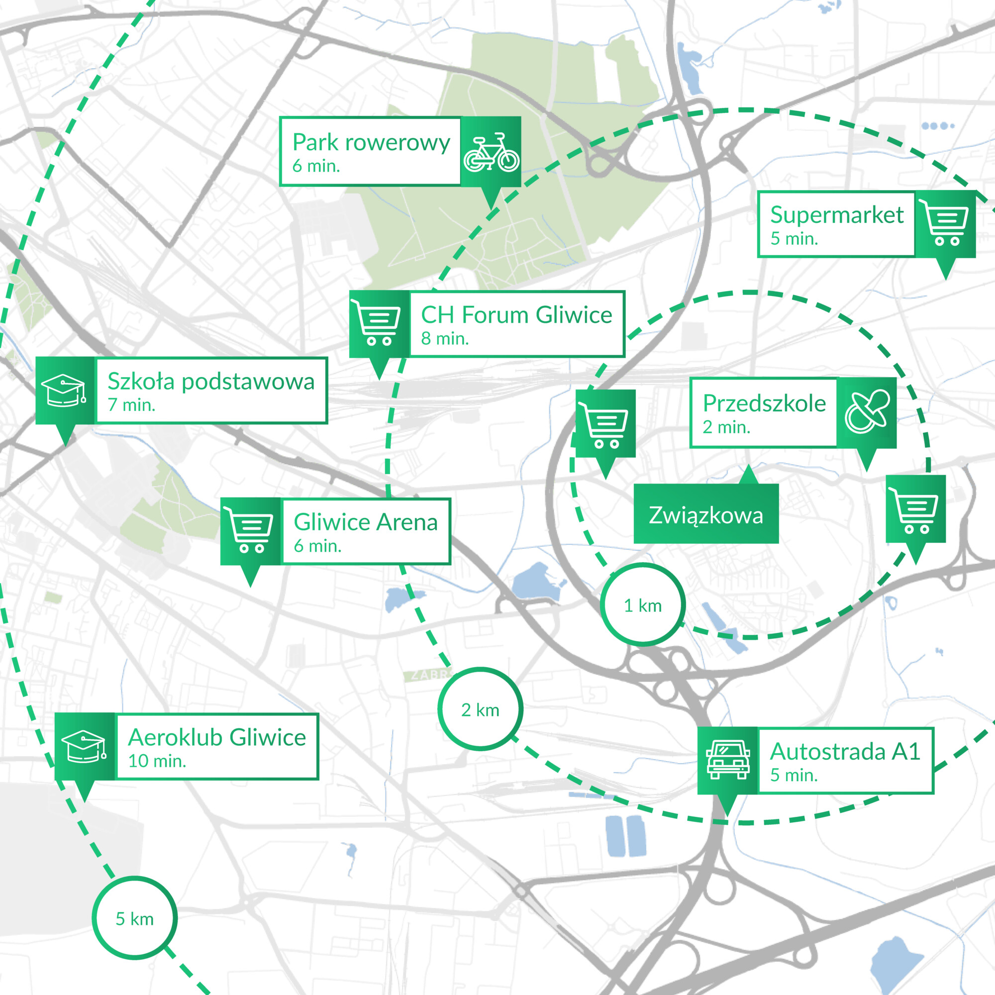 Inwestycja znajduje się w jednej z najlepiej skomunikowanych dzielnic całego regionu. Szybko możesz dotrzeć do centrum miasta, sklepów, punktów usługowych i terenów rekreacyjnych.
